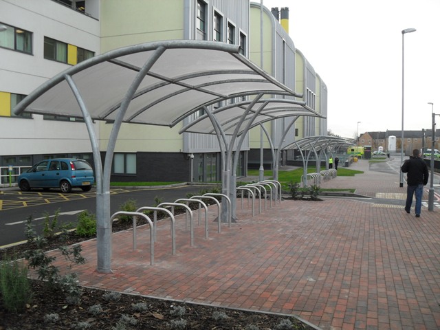 This was Pinderford & Pontefract Hospital Joint Venture project with Balfour Beatty as main contractor. The contract was to supply cycle storage throughout the hospital grounds to suit various different ground levels.Blueton won the order of 12no Ref 4000 cycle shelters (5100mm long) with bespoke extended legs to suit the ground gradients. The total capacity was (144no bikes).