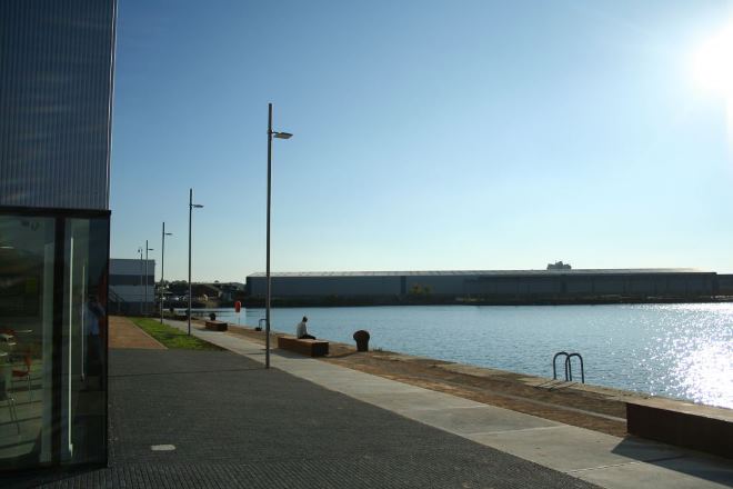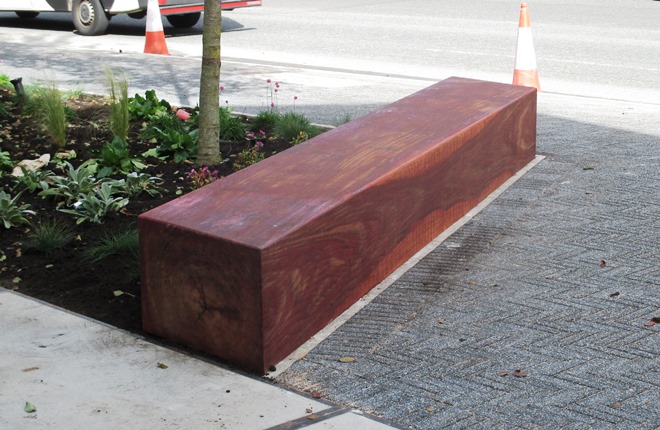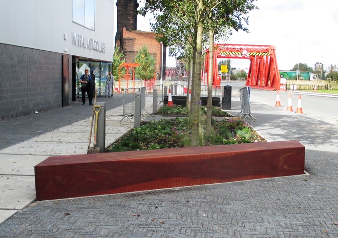 Description: Morgan Sindall asked Blueton to manufacture Beam benches for a marine environment, at their project in the Wirral dockland area. Our solution was to use a marine grade of timber for these harsh conditions, with a stunning result of deep red colour.