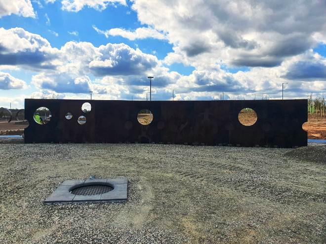 The Centrepiece of Ravenscraig Park is a curved climbing wall, measuring 16mts long x 2750mm high. The park built on the the site of the old Ravenscraig Steel Mill, the wall made from Corten steel to reflect its history, pre weathered & sealed finish, with artwork from the local schools, laser cut into the panels, along with peep holes. Can't wait to see the kids all over it.