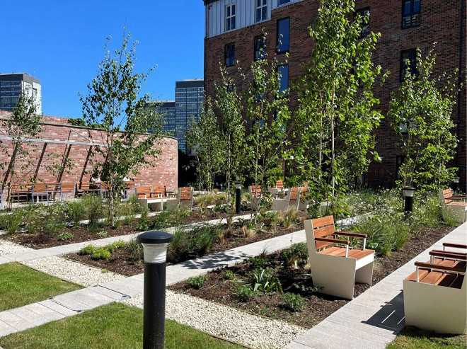 Cottonyards is a stunning development of one, two and four bedroom apartments situated on the corner of Commercial Road and Old Rutherglen Road within the popular area of New Gorbals, just south of the River Clyde. The central courtyard is a mix of planting, paving and seating areas, with Blueton seating and table sets.