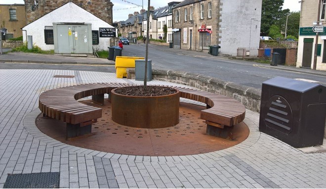 Central feature of Corten steel planter, tree grill & circular seating for East Calder.